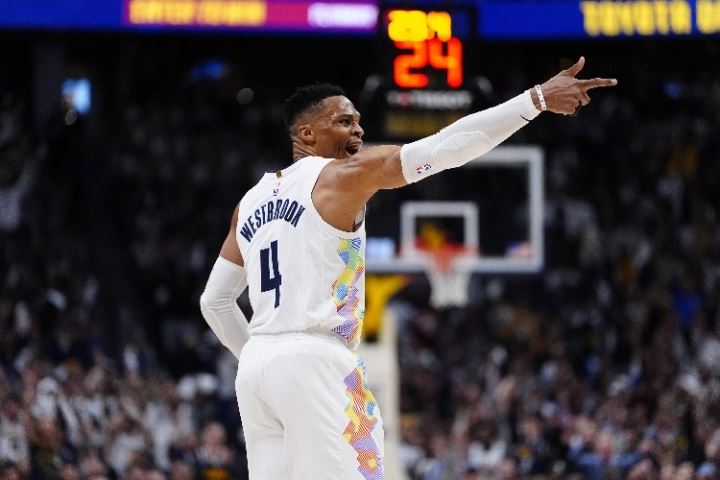2024-25赛季,威少为掘金出战75场常规赛,场均拿下13.3分4.9篮板6.1助攻1.4抢断;季后赛,威少出场13次,场均得到11.7分3.7篮板2.6助攻。