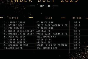 体育资讯07月26日讯 金童奖官方发布了最新更新的2025年金童奖排名,亚马尔以97.9分居首,杜埃95.3分位列次席,库巴西位列第三,斯凯利第四,居勒尔位列第10。皇马、巴萨、巴黎、阿森纳均有两人位居前十。其中,亚马尔已于去年赢得了金童奖。