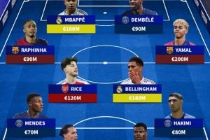 前锋:姆巴佩(1.8亿欧)、登贝莱(9000万欧)
